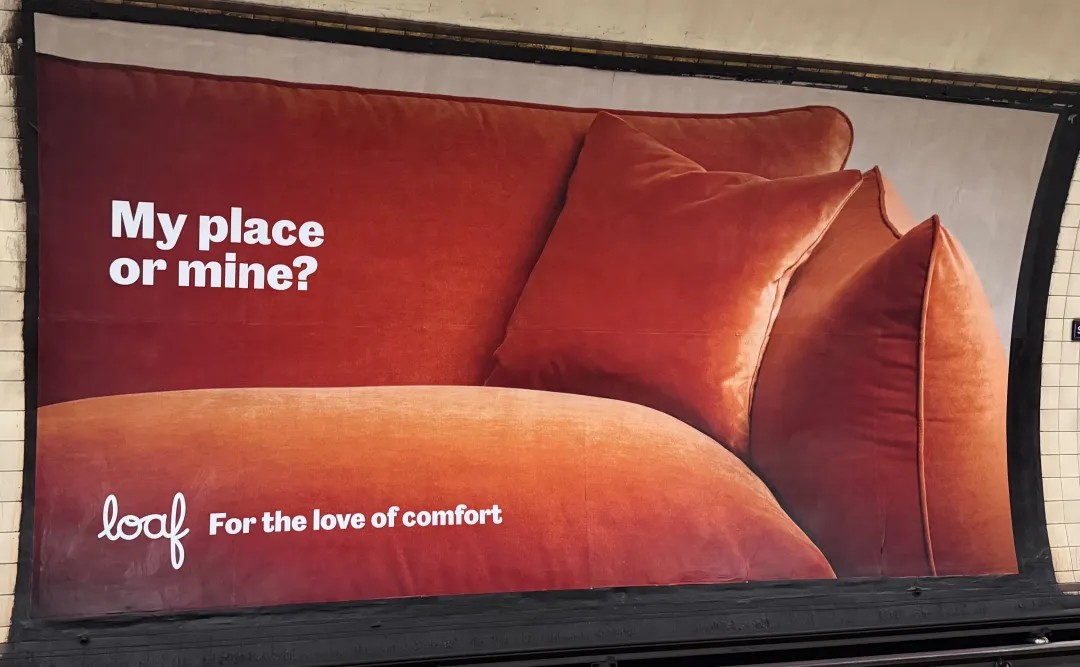 ”去我家?还是去我家?“文案直接压在橙色的沙发上。这句文案用了约会后的一句梗:“My place or yours 去我家还是去你家“。