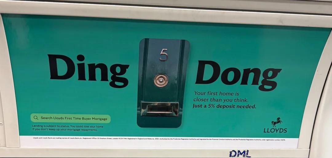 在劳埃德(小马)银行标准的绿色背景上,斗大的叮咚二字,搭配5号房间醒目的门铃图片。内文:你的第一个家比你想象的要近。首付只要5%