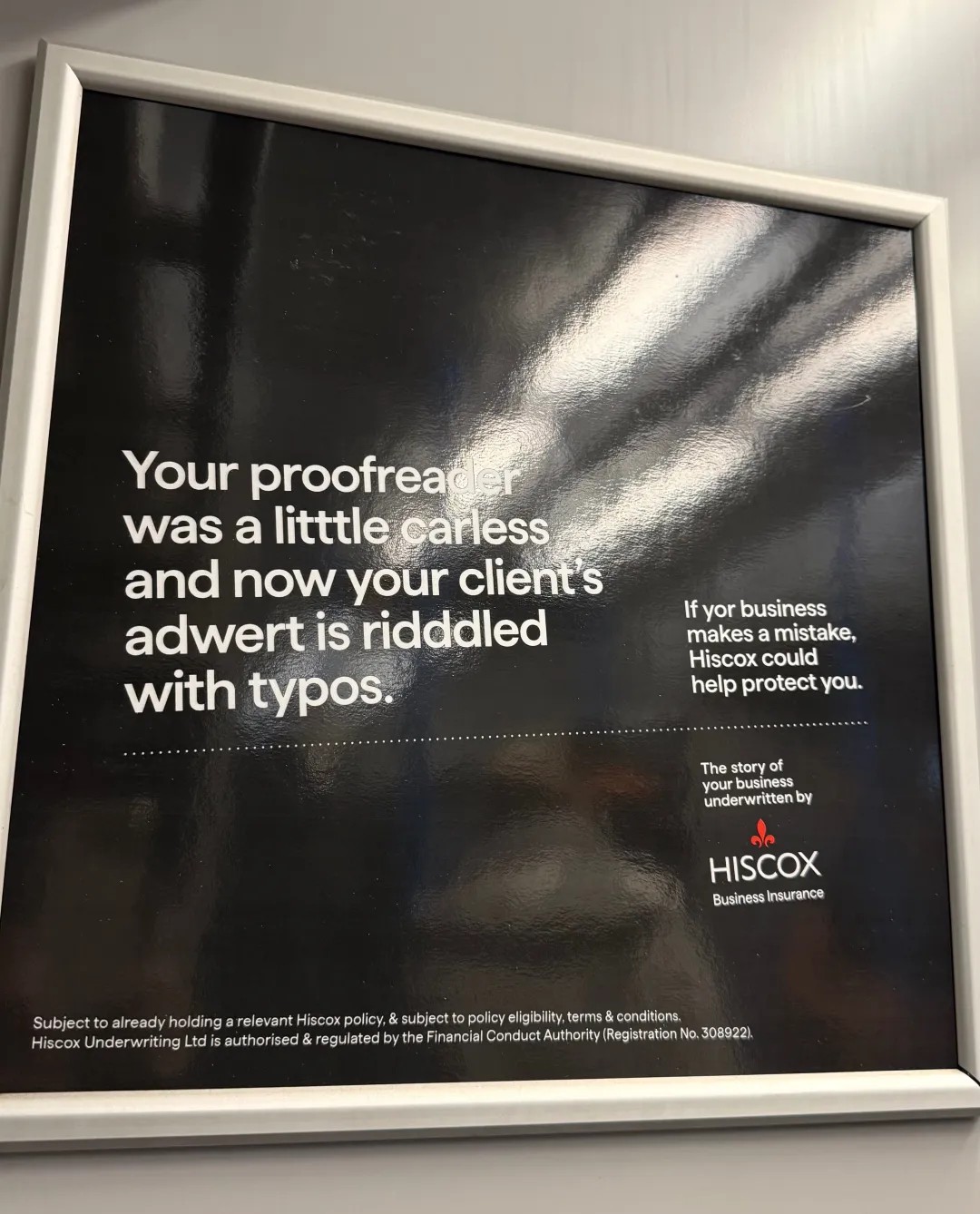 “你的校对有点粗心,现在你的客户广告充满拼写错误”,这种错误是广告公司和广告主的噩梦,只要买了HISCOX的保险,就可以获得赔付。