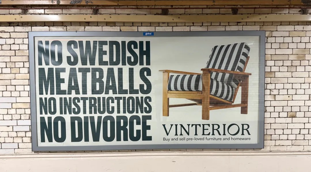 Vinterio显然是以幽默嘲讽宜家,潜台词就是我们卖高质量二手复古家具,不卖快消家具,没有复杂的说明书,没有因安装家具导致的家庭纷争。