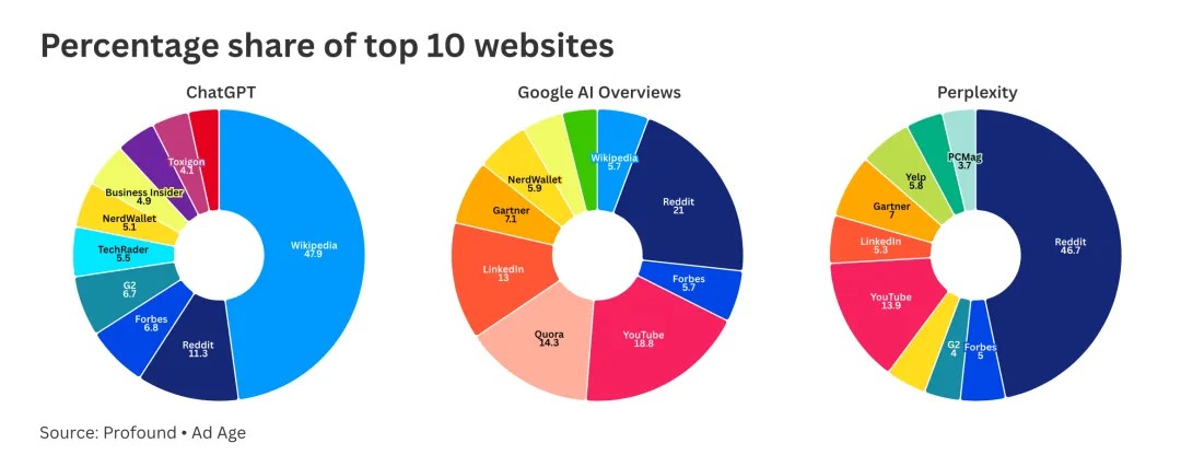 从Adage的数据来看,世界上三大AI搜索(ChatGPT,Google,Perplexity),主要数据来源有这么几类:
