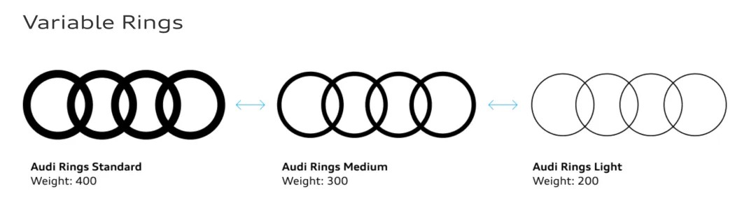 而奥迪本身的品牌识别,在2021年有了很大的变化,最大的特色就是flexible灵活设计。车标不仅是扁平了,而且线条粗细和Audi文字一样,粗细可以根据排版需要,灵活变化。